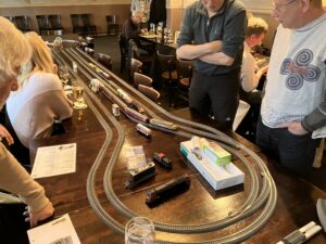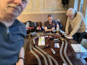 Skandinavische Modelle prägten den Schienenverkehr beim MIST1 am 24. April. Aus dienstlichen Gründen bauten wir diesmal wieder eine echte Tischbahn auf. Dank des von Roger Wiese sowohl digital als auch auf Papier vorbereiteten Gleisplans und bereits digitalisierter Weichen ging nicht nur der Aufbau recht schnell (nachdem Roger sich durch den Stau gekämpft hatte), sondern wir konnten auch die Weichen ferngesteuert stellen.